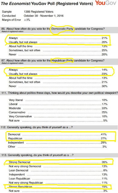 I drew a yellow line from the party ID to the result in the one above so you can see how their sample gave them the 12 advantage for Hillary they reported in late October that had everyone claiming Trump should drop out. Yet, as their party ID sample tightened, so did their result. which should tell you to always, always ignore any and all Post/ABC polls.