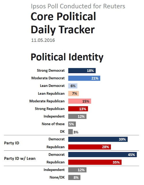 No explanation needed for Ipsos poll above. 39% Democrats to 28% Republicans. Oh they move within 1point closer to 10% difference when asked how they lean. WOW, Big deal! Nothing more to see on this useless poll. On to the next one.