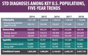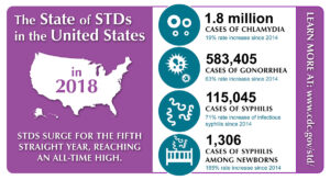 According to the annual Sexually Transmitted Disease Surveillance Report, STDs increased for the fifth consecutive year – with nearly 2.5 million combined cases of chlamydia, gonorrhea, and syphilis. Cases of congenital syphilis – syphilis passed from a mother to her baby during pregnancy– increased 40 percent from 2017-2018. Congenital syphilis can result in miscarriage, stillbirth, newborn death, and severe lifelong physical and neurological problems. CDC